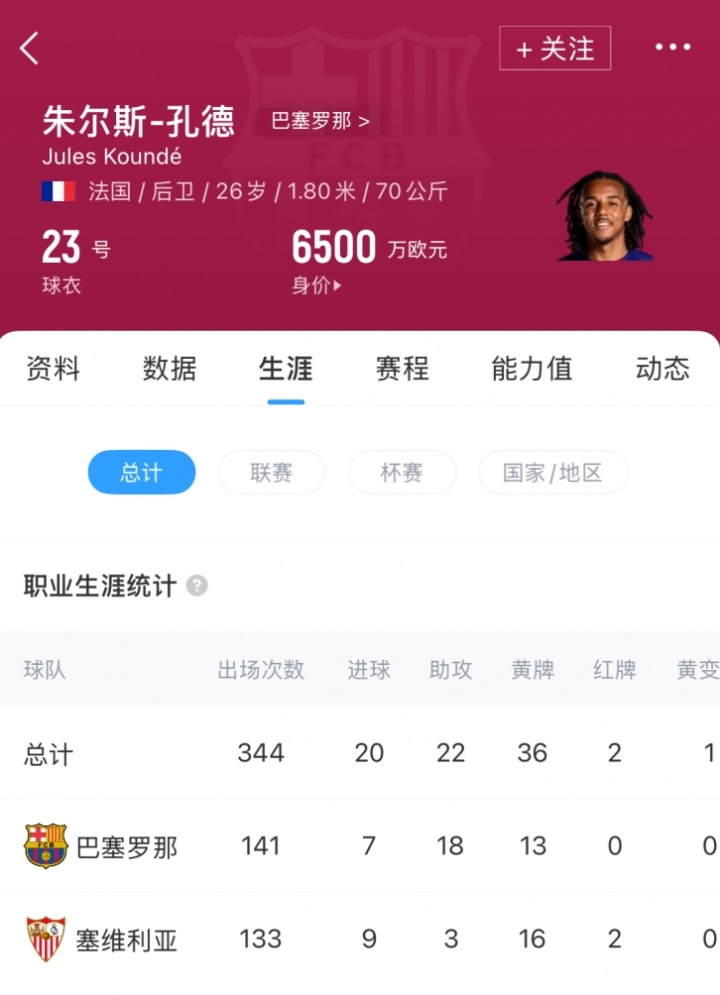 在刚刚结束的赛季中,孔德出战53场比赛,交出4球8助的成绩单,助力巴萨包揽西甲联赛、国王杯和西班牙超级杯三项桂冠。